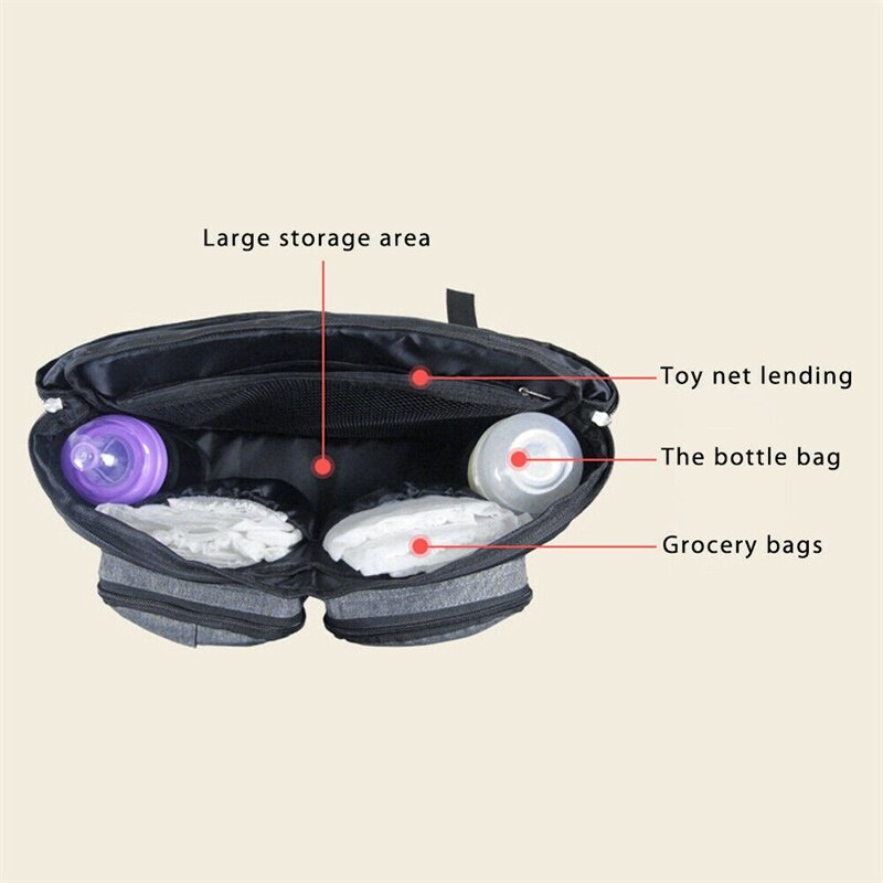 LARGE SPACE STROLLER ORGANISER FOR BUSY LIFE-Large volume with 14'' L X 10'' H X 6.5'' W, with 2 deep drink holders for standard 500ML water, coffee or milk bottles. Able to put 6-8 nappies, 1-2 baby changing clothes, 2x wipes, 1x baby body lotion, 1x sun cream, 2x mobiles, 2-3 small toys, keys, snacks, 1x purse, 1x ipad, some books, 1x folding umbrella, etc in the pushchair storage bag.