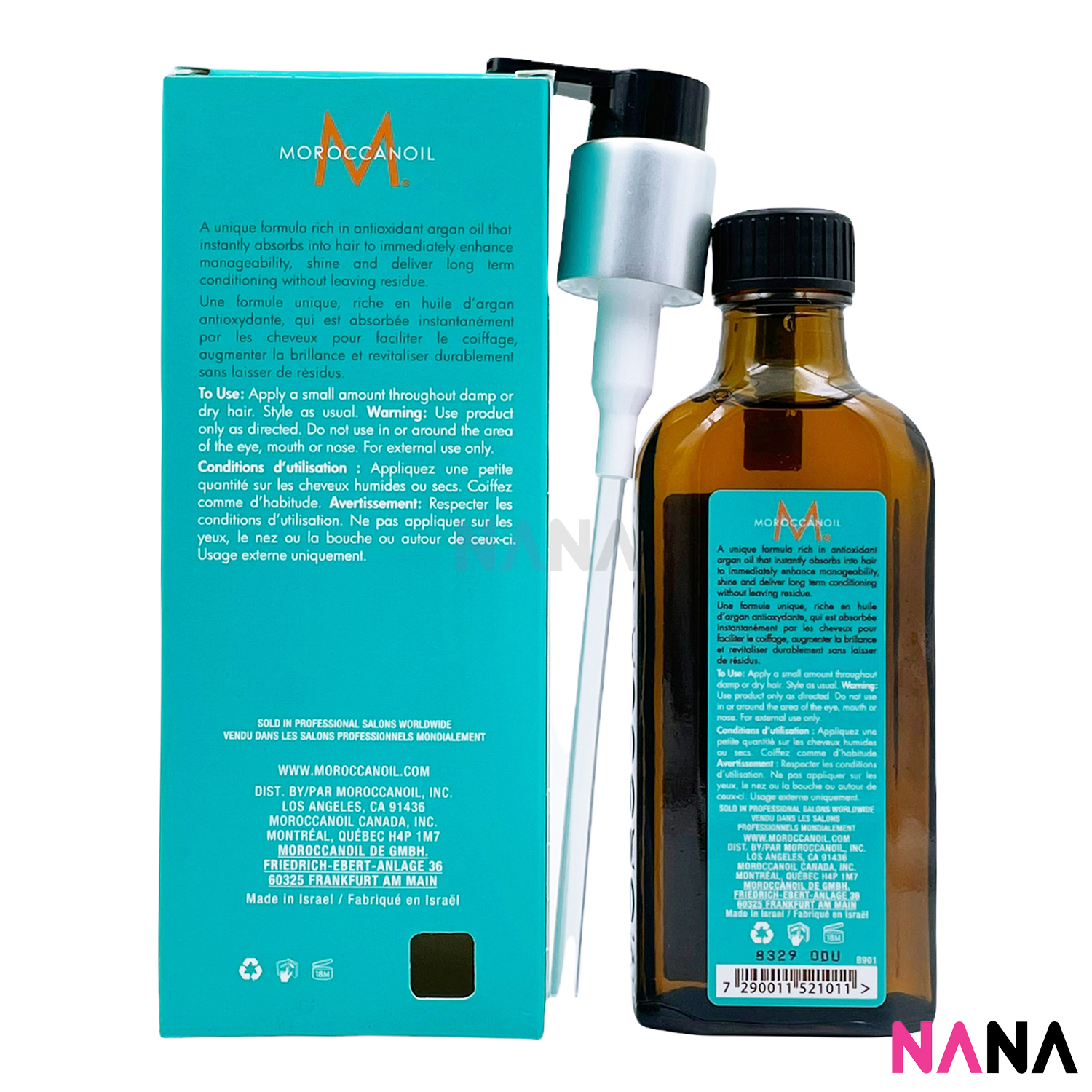 How to use:After shampooing and conditioning, start with a small amount in the palm of your hands and work it through damp hair. Style as usual. Apply a few drops as often as needed to achieve soft, shiny hair.Before applying color, massage approximately 5ml of Moroccan Oil Treatment to hair. This will enhance the hairs ability to absorb the color.Ingredients:Cyclopentasiloxane, Dimethicone, Cyclomethicone, Butylphenyl Methyl Propional, Argania Spinoza Kernel Oil (Argan Oil), Linseed (Linum Usitatissimum) Extract, Fragrance Supplement, D&C Yellow-11, D&C Red-17, Coumarin, Benzyl Benzoate, Alpha-Isomethyl Ionone.