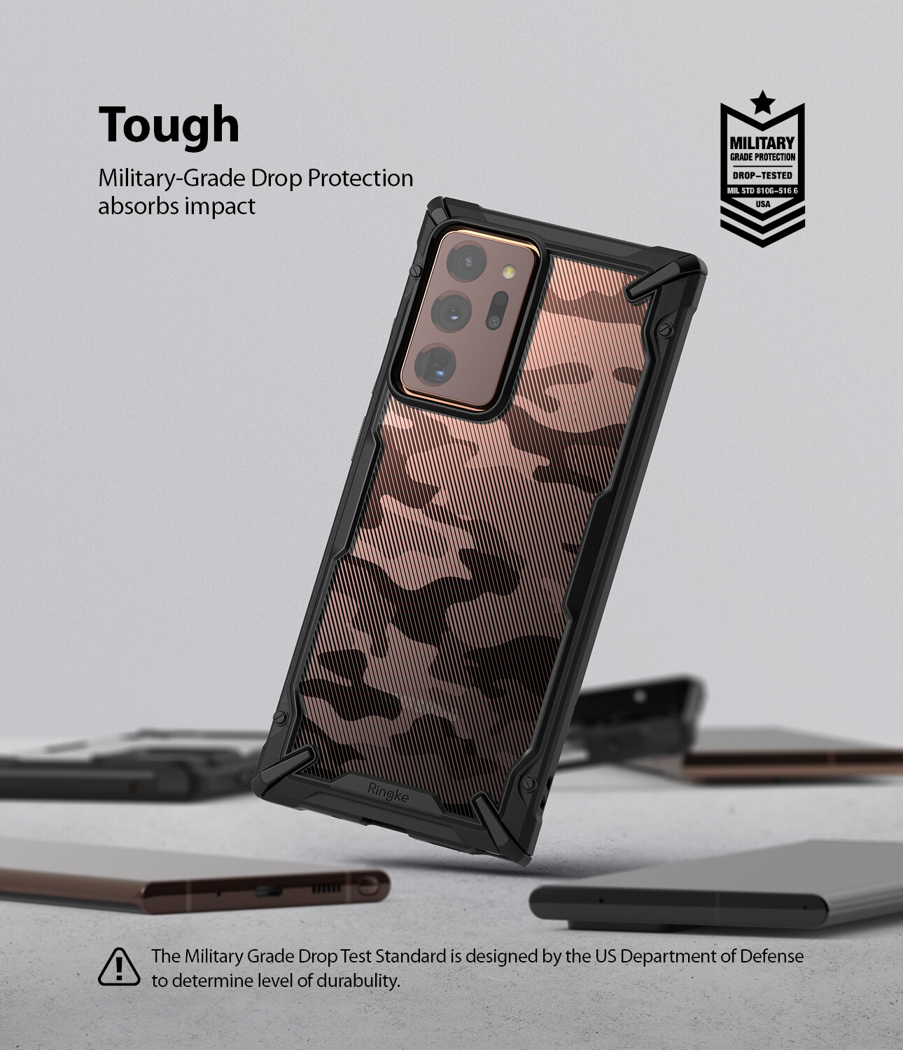 Ringke FUSION-X offers MIL-STD 810G - 516.6 Certified Military Grade Drop Protection. *Phones survived professional drop test from a height of 4 feet (48-inches) onto an impact surface 26 times.