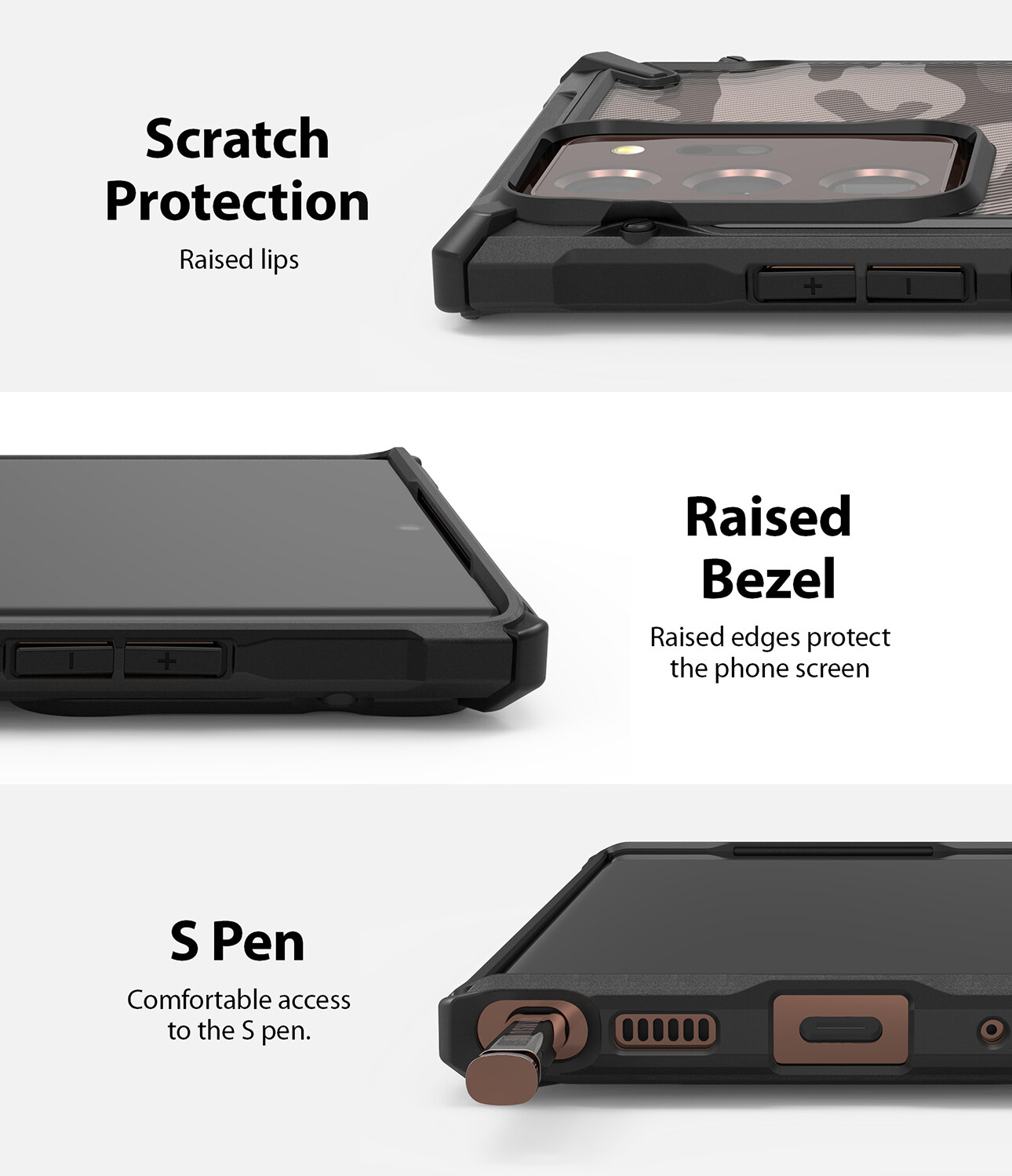Durable thermoplastic urethane bumper protects all of the well-rounded sides and flawlessly fits all edges. The added addition of ridges in the TPU bumper adds a boosted grip control for comfortable handling. The raised front lip prevents your screen from touching a flat surface, and the rear camera also includes a tapered back lip to protect the lens.