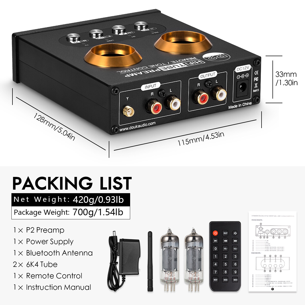 - P2 is a tube preamp which needs to work with amplifiers or active speakers, cannot drive passive speakers or used with turntables directly. In RCA input mode, the previous / next song function is invalid.