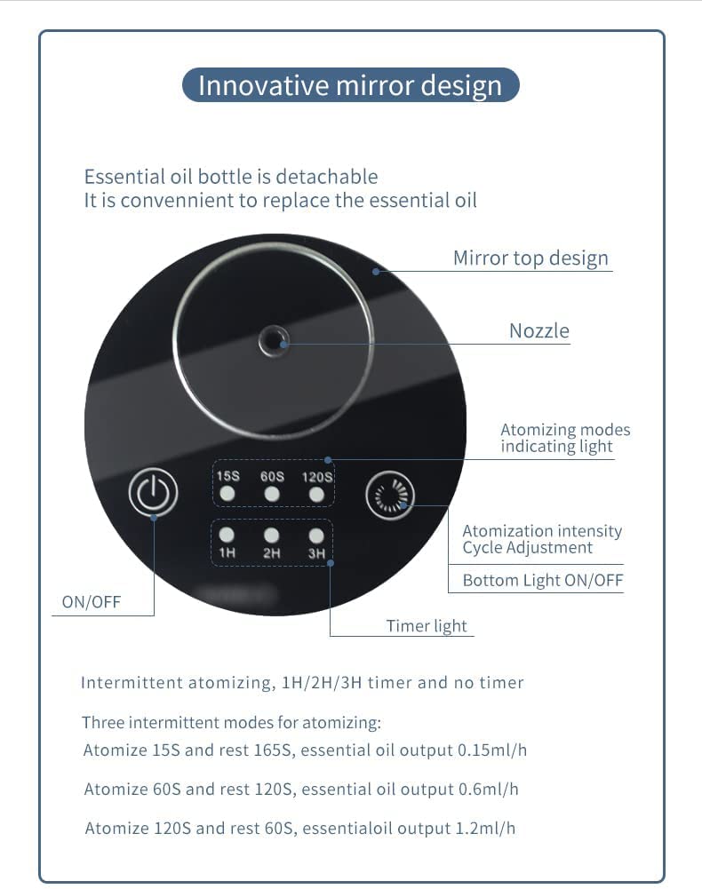 Diffuser maintenance Clean the nozzle every week, pour alcohol after dry the water,and run the machine for about 1 hour. The nozzle can be cleaned before changing essential oils to avoid mixing of essential oils. The concentration of each essential oil is different, so the consumption of essential oil is also different, and the spray effect is also different. Some essential oils may not be visible to the naked eye. But the fragrance of essential oils spread out, indicating that the machine is operating normally. After receiving the machine, you can test it with alcohol first. If you find quality problems, Contact the buyer in time for after-sales service. If there is a problem after using the essential oil, we do not provide free return and exchange services, only repair services. #aromadiffuser #aromatherapy #gift #Accumulator #aromatic #timing #Portable #Fragrant #cararomadifuuser #scentdiffuser