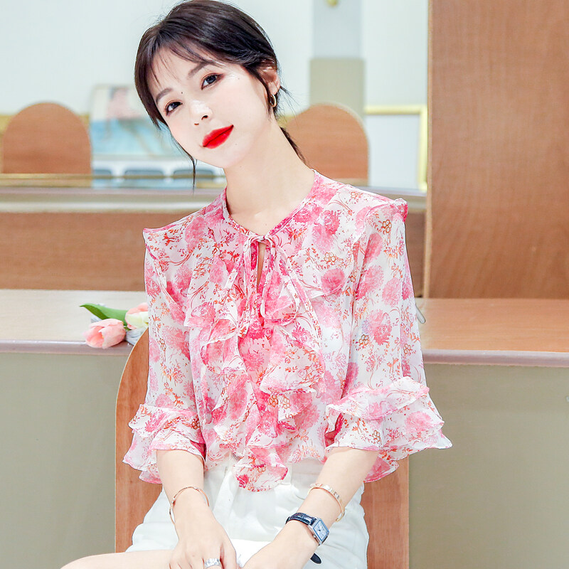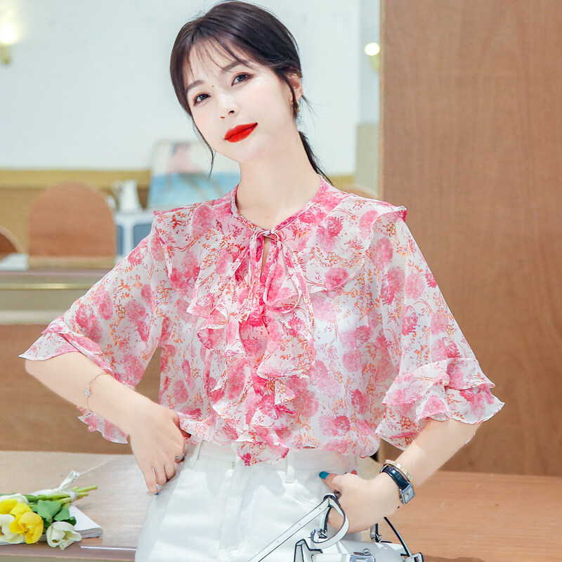 AFEG Korean style women's short-sleeved floral chiffon blouse for women