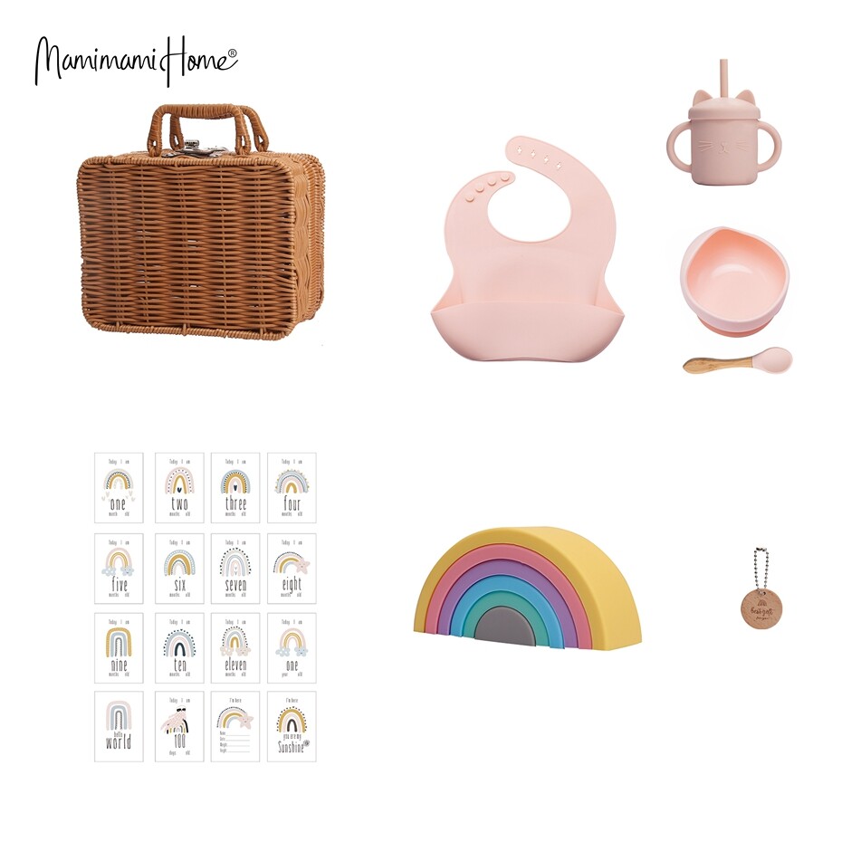2.Peach Set: 1 x Silicone Bib,1 x Silicone Spoon,1 x Sippy Cup,1 x Silicone Bowl,1 x Silicone Building Block,1 x Rattan Box,16 x Milestone Cards