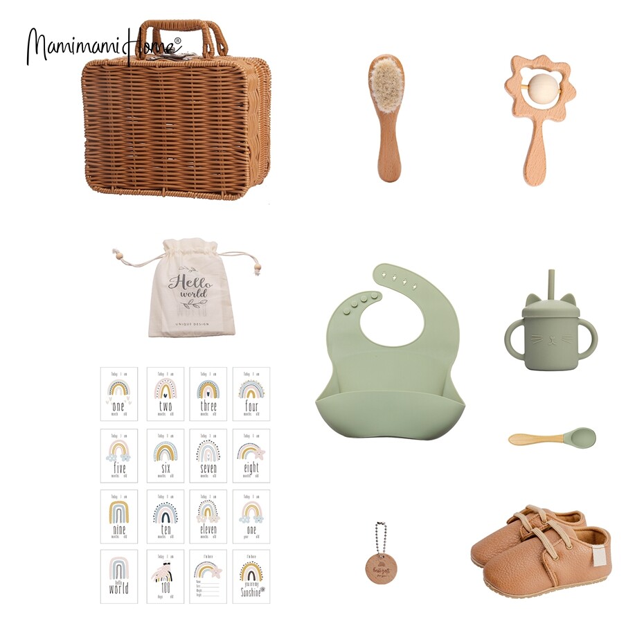 Package: 1.Bean Green Set: 1 x Silicone Bib,1 x Silicone Spoon,1 x Sippy Cup,1 x Wooden Brush,1 x Wooden Rattle,1 x Baby Shoes,16 x Milestone Cards,1 x Rattan Box