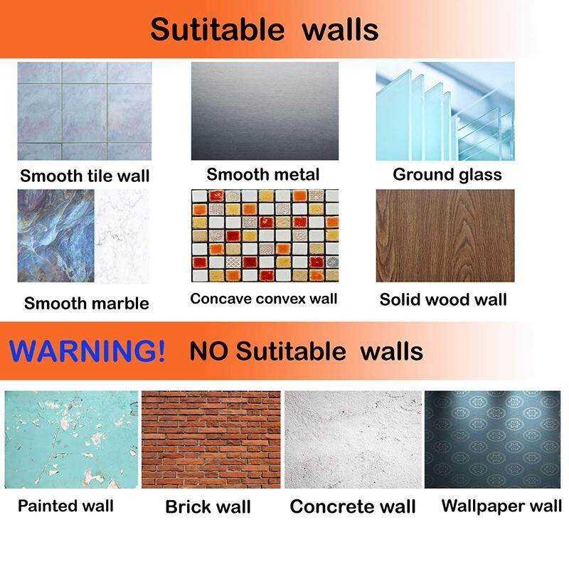 Clean, dry and smooth wall surfaces such as ceramic tiles, marble stone, metal, glass etc. (not suitable for concrete wall, wallpaper wall /brick wall or painted wall). Rest it for 24 hours to ensure better adhesive before hanging things on it.