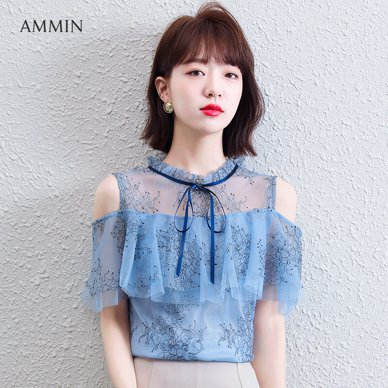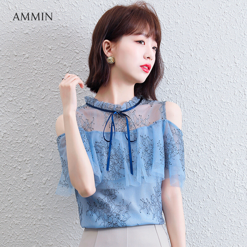 AMMIN Tops 2021 summer Korean version of the new pleated wood ear stitching round neck bow tie off shoulder ruffled stitching chiffon shirt women's elegant and sweet short-sleeved hollow mesh stit