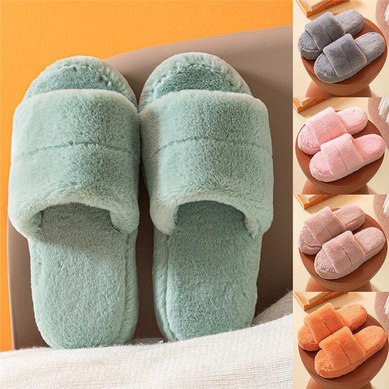 Home Slippers Solid Color Winter Plush Warm Flat Home Shoes Soft Shoes Open Toe Indoor Slippers