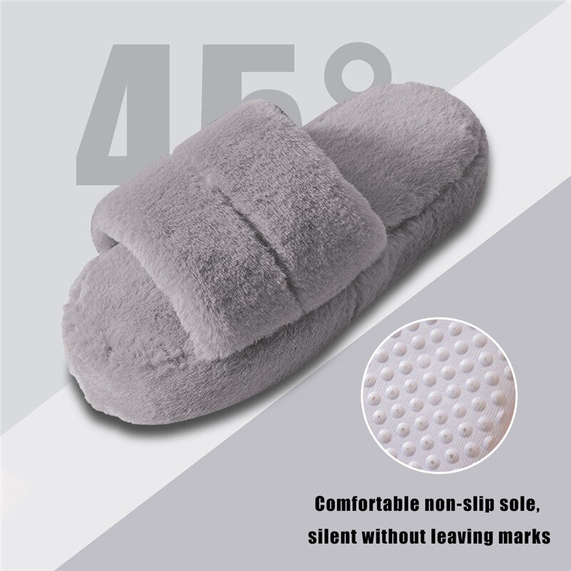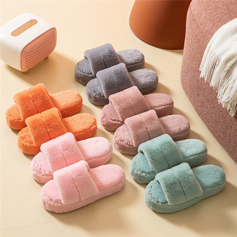Features:Home Slippers Solid Color Winter Plush Warm Flat Home Shoes Soft Shoes Open Toe Indoor Slippers