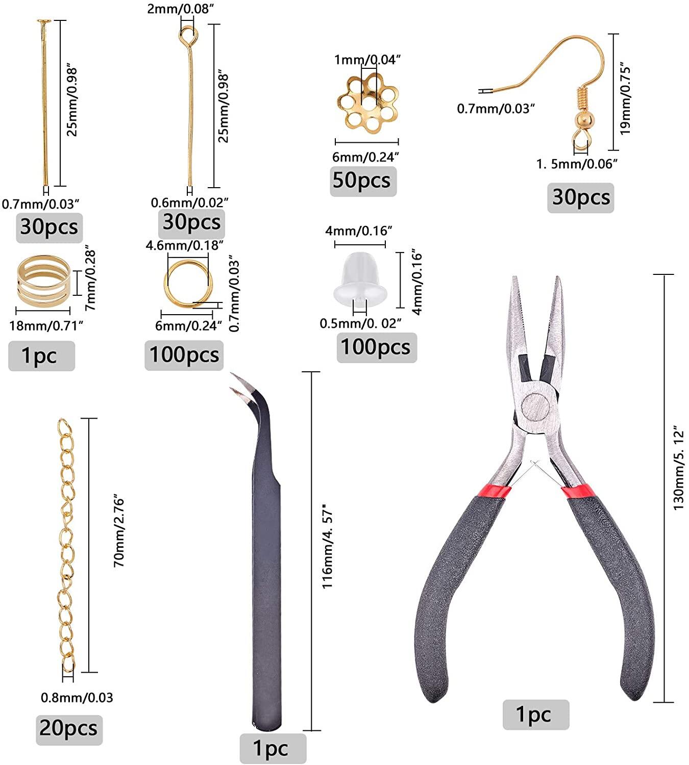 Earring Making Kit: package includes 100 x iron 6mm jump ring, 50 x iron bead caps, 30 x 304 stainless steel eye pins, 30 x 304 stainless steel flat head pins, 30 x brass earring hooks, 20 x iron chain extender, 100 x plastic ear nuts, 1 x jump ring opener, 1 x carbon steel needle nose plier, and 1 x stainless steel tweezer; totally 363 pcs in the package.