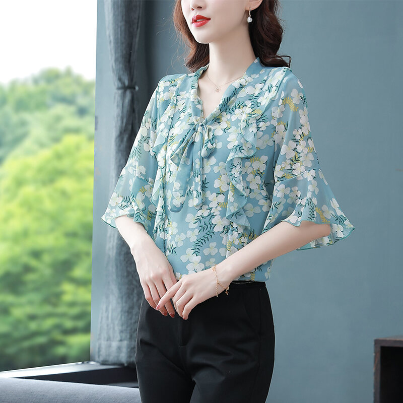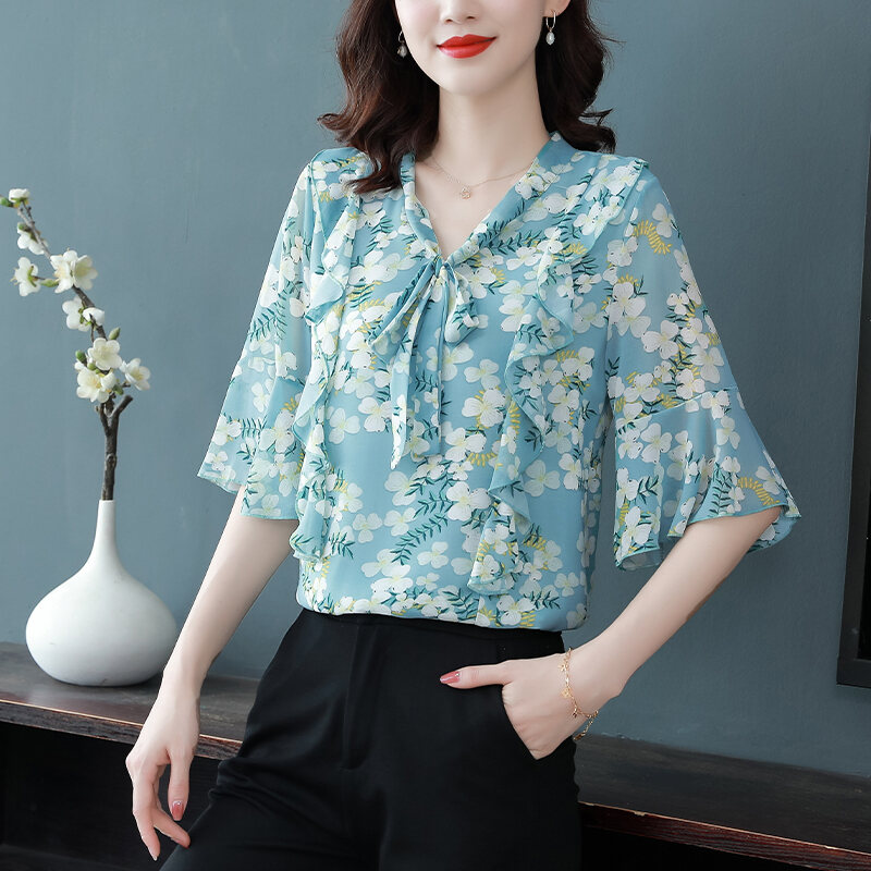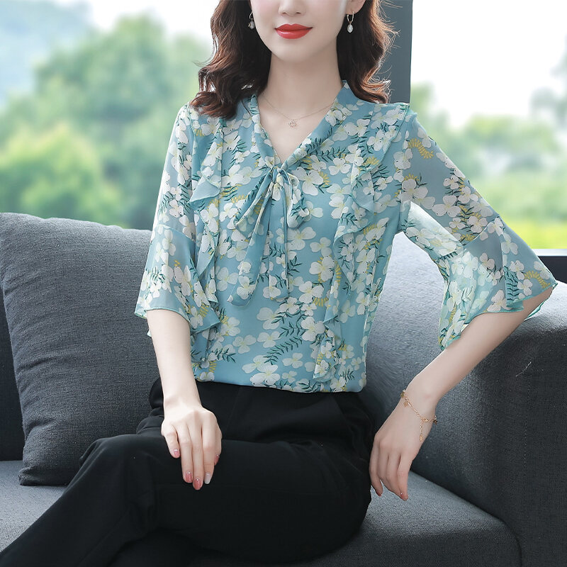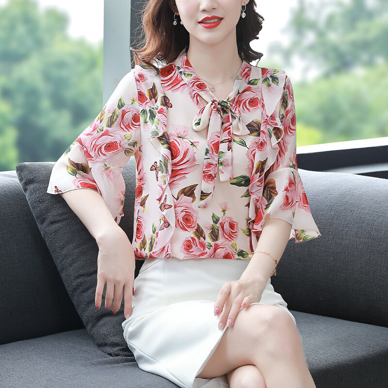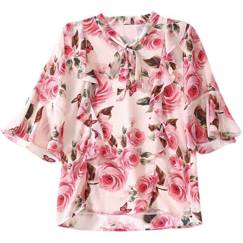 New Floral Chiffon Shirt Women's Fashionable Elegant Small Shirt Age-Reducing Stylish Chiffon Top
