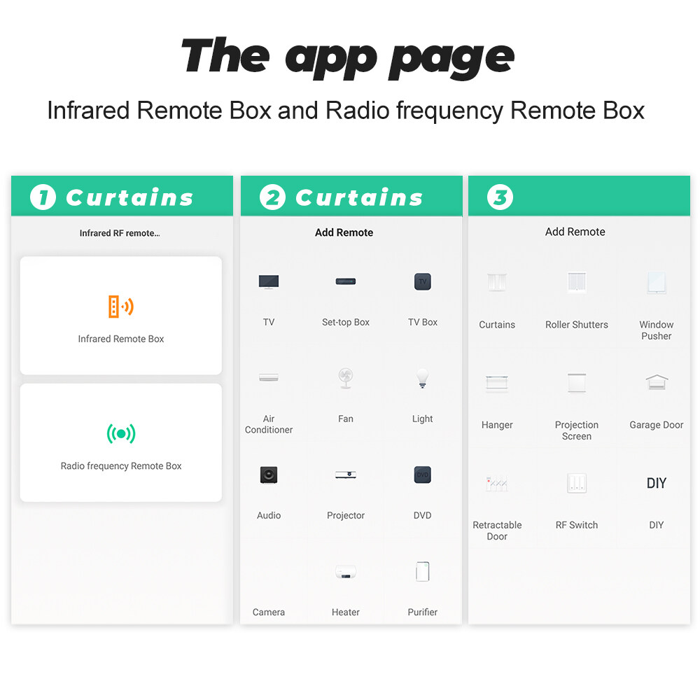 With this Universal IR Remote Control, you can use your smart phone to control home appliances, such as STB(Set-Top-Box), TV Box, TV, Air Conditioner, Fan, DVD, and Curtanins, Roller Shutter, Window Pusher,Hanger, Projection Screen, Garage Door, RF devices etc.