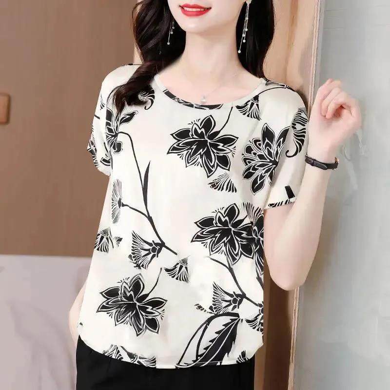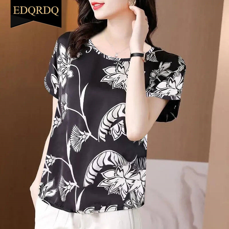 Women's Round Neck Short Sleeve Tops Satin Silk Floral Printed T Shirts