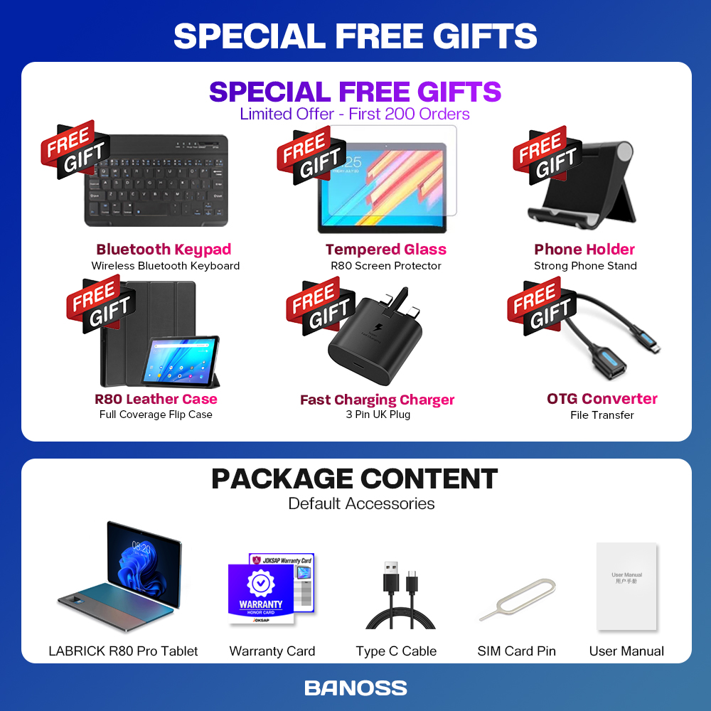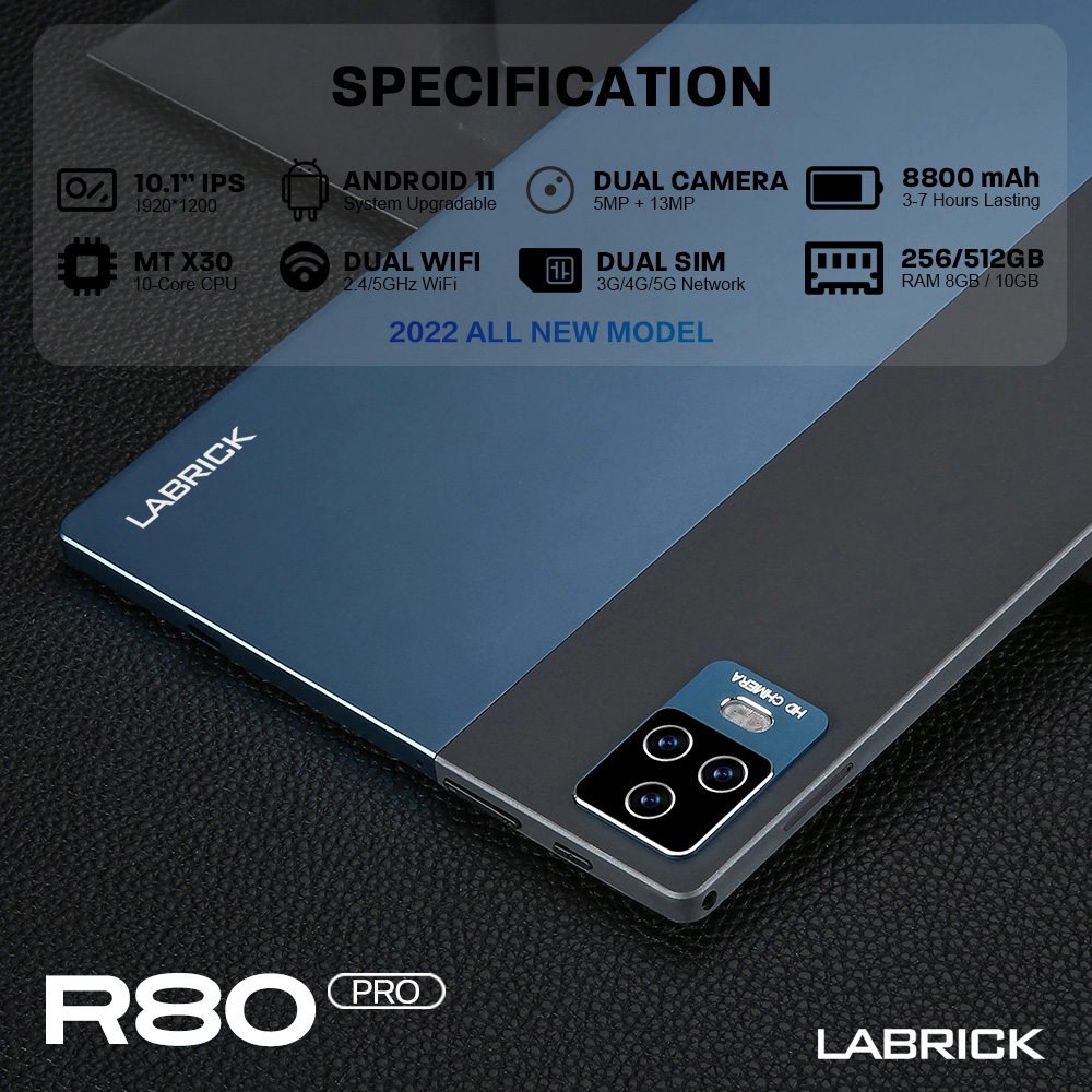 BRAND PROMOTION: 【Buy 256GB Ship 512GB】- Customer just need to order 8GB+256GB variant, then seller will auto ship 10GB+512GB without paying price difference. Limited Quantity Offer 100pcs for sales ONLY!!! WARRANTY: 【1 Year International Warranty】- Comes with LABRICK Official warranty card. We support 1 year free item warranty, in case the item getting any issue without non-aritificial damages, we can repair and even give 1to1 exchange new item. PRODUCT FEATURE: 【SUPERIOR WATCHING EXPERIENCE】LABRICK R80 Pro Tablet is powered by 10-Core Processor. 2022 upgraded Android 11 tablet provides + 40% faster processing speed than regular Quad-Core. 10.1-inch Tablet screen size with 1920x1200 resolution support, perfect for home entertainment and office. DUAL-BAND WI-FI】The 2022 LABRICK R80 Pro Built-in Dual-band wifi module, Support 2.4/5Ghz wifi, the faster wifi you get, the more stable wifi for your smoother watching movie experience. 【DUAL-SIM】The 2022 LABRICK R80 Pro Tablet support dual SIM feature, support 3G/4G/5G netowrk, and also support phone call feature. All-in-One Tablet that make your life experience be more easier and convenient. 【BIGGER THAN BIGGER】The tablet has 8GB RAM, 256GB/512GB internal storage. The GMS Certified latest Android Tablet, with basic Google apps already on and without bloatware. Get rid of unexpected ads and download apps from Google Play, such as SKYGO, NetFlix, YouTube and more. 【LONG LASTING BATTERY】Equipped with a long-lasting and environmentally compliant 8800 mAh battery, this 10-inch tablet will effortlessly provide you with up to 8 hours of support for reading, browsing, watching movies and playing games. The long-lasting battery life and lightweight design allow you to enjoy your tablet anywhere, anytime. 【DUAL CAMERAS AND SPEAKERS】With front 5 MP & Rear 13 MP dual cameras, which would bring your excellent photos and clear video chats. Dual speakers are designed to provide high-quality and powerful sound for your favorite music, games and videos. SPECIFICATIONS: Model: LABRICK R80 Pro (2022) CPU: X30 10-Core System: Android 11 (System Upgradable) Screen Size: 10.1 Inches IPS Screen Screen Resolution: 1920 * 1200 WiFi: Dual Band 2.4G/5Ghz WiFi Bluetooth: BT 4.0 Battery: 8800mAh Li-on Battery Camera: Front 5MP + Rear 13MP Speaker: Dual Stereo Speaker RAM: 6GB/8GB/10GB ROM: 128GB/256GB/512GB Cellular: 3G/4G/5G DUAL SIM Charging Port: Type C WHAT'S IN THE BOX: 1 * Tablet PC 1 * User Manual 1 * Type C Cable 1 * SIM Card Pin 1 * Official Warranty Card SPECIAL FREE FITS: 1 * Leather Flip Case (Limited Gifts) 1 * Bluetooth Keyboard (Limited Gifts) 1 * Tempered Glass Screen Protector (Limited Gifts) 1 * OTG Converter (Limited Gifts)