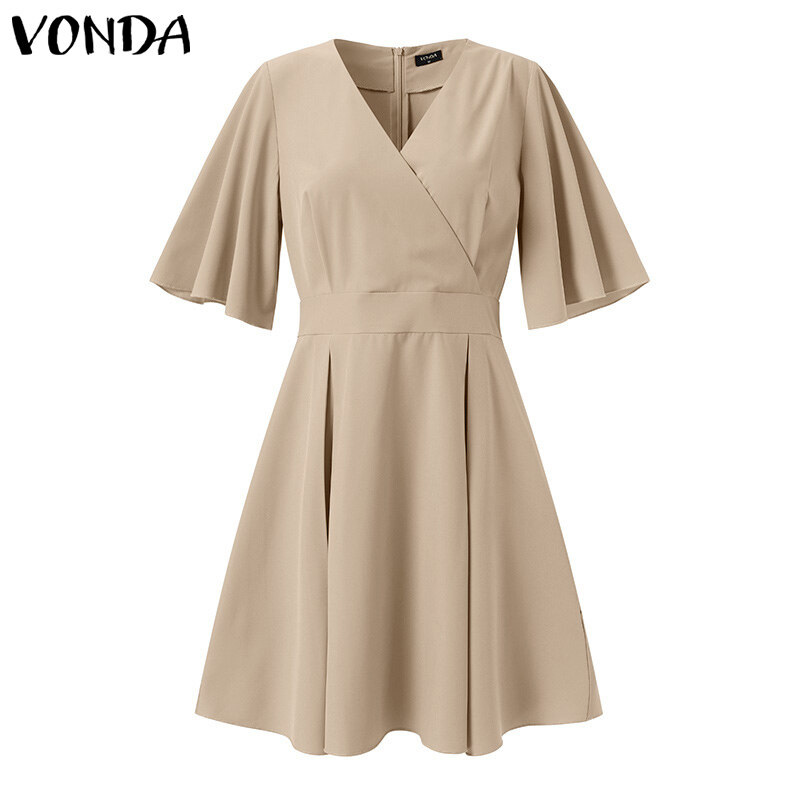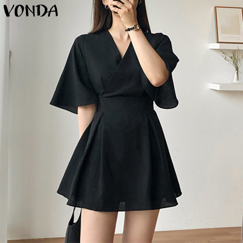 VONDA Women Short Sleeve V Neck Holiday Tunic Dress Fashion Pleated Party Mini Dresses (Korean Causal)