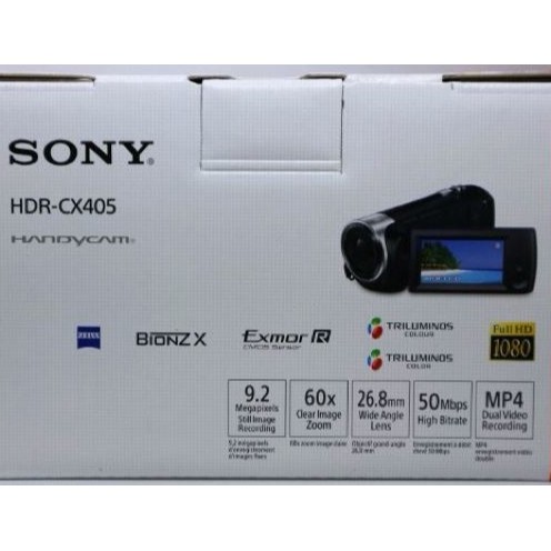 The Sony HDR-CX405 HD Handycam features an Exmor R CMOS sensor and a wide-angle Carl Zeiss zoom lens with 30x optical zoom. The CX-405 captures Full HD 1920 x 1080 video at 60p and 9.2MP still images to optional Memory Stick Micro and microSD/SDHC/SDXC media cards. The Exmor R CMOS sensor is designed for increased sensitivity in low light situations and the Optical SteadyShot image stabilization with Intelligent Active Mode delivers smooth video. Users can monitor and playback footage via the 2.7" LCD display with 230K dot resolution. The camera records using XAVC S codec at up to 50 Mb/s and features dual recording, which lets you simultaneously capture both high-quality AVCHD and web-optimized MP4 files.