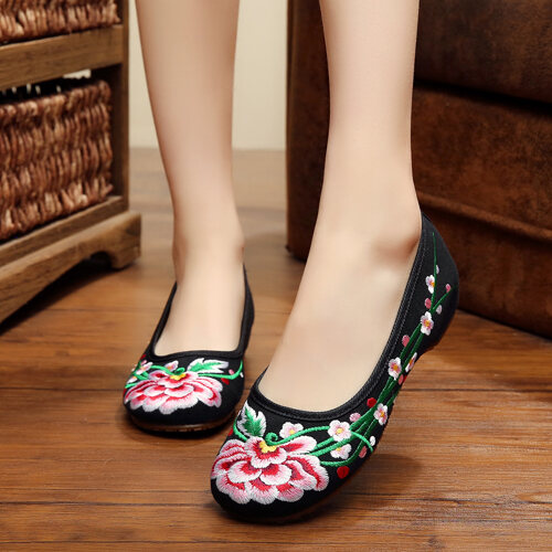 new style ankle-wrapped peony old Beijing beef tendon bottom cloth shoes red black hidden height embroidered shoes dance Hanfu shoes autumn women