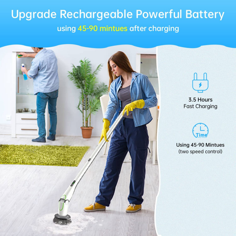【 Powerful & Cordless Spin Scrubber 】The power spin scrubber needs only 2.5 hours fast charging which can last continuously cleaning up to 1.5 hours at least. 84W high power motor support 360-degree high-speed revolution, and cordless design meet your need of long working duration to clean and wipe the dirt thoroughly without interruption. Especially healthy for back pain and arthritis. Save a lot of time for daily cleaning.