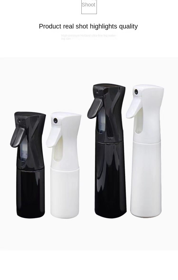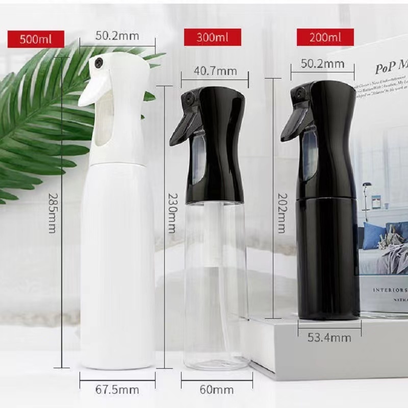 ype: spray bottleColor: black, white,transparentMaterial: PETCapacity: 200ml/300ml/500mlProduct size: 200ml: 22.2*5.34*5.02cm /300ml: 23*6*4.07cm /500ml: 28.5*6.75*5.02cmquantity: 1The package includes:1 x spray bottle (empty)