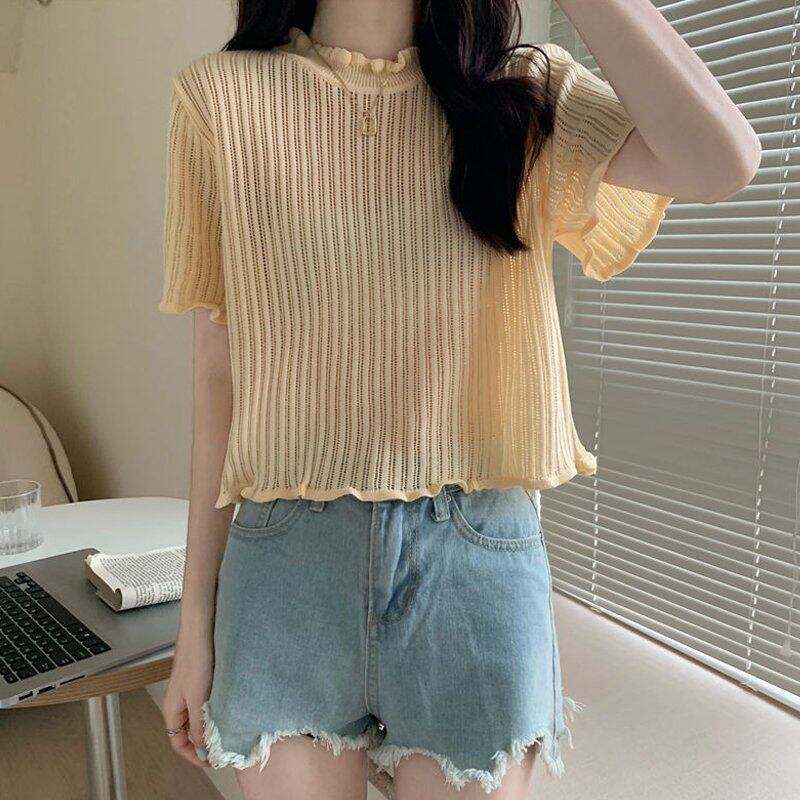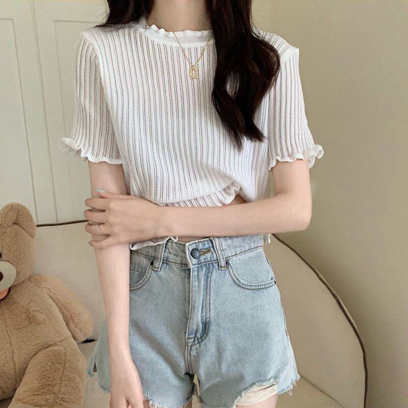 INWPLLR Women Korean Agaric Edge Collar Tops Newest Knitting T-shirts Summer Thin Short Sleeve Female Tshirts