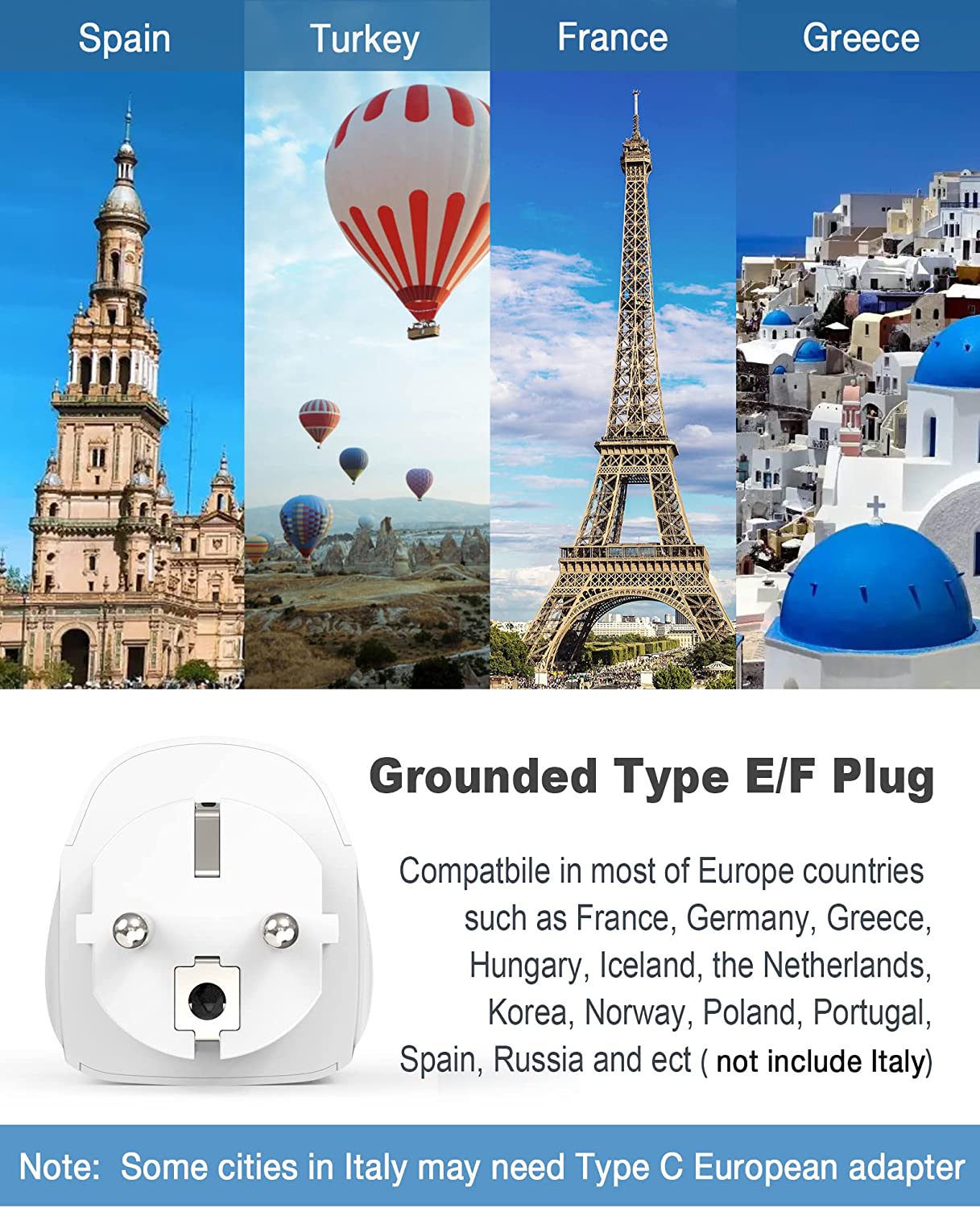 Works in European Countries: Type E/F Plug is compatible in most of European countries such as Belgium, France, Germany, Greece, Hungary, Iceland, the Netherlands, Norway, Poland, Portugal, Spain, Russia, Korea and more. (Note: some cities in Italy may need other type adapter, please choose the suitable plug before your travel)
