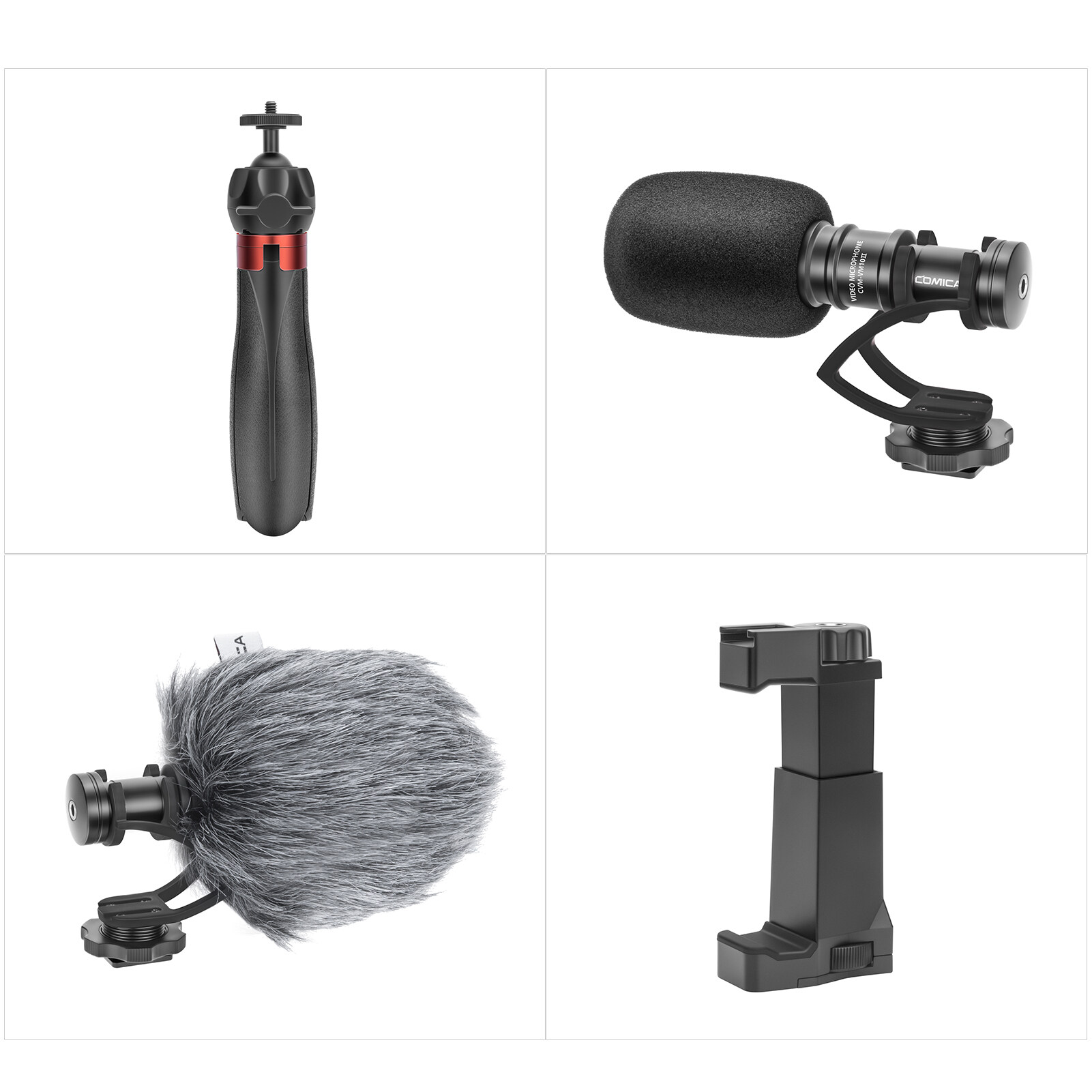 COMICA CVM-VM10-K2 Pro Multi-functional Smartphone Video Vlog Kit with Cardioid Microphone Ball Head Tripod Phone Holder 3.5mm TRS to TRRS Cable Foam Fur Windshield Carrying Bag