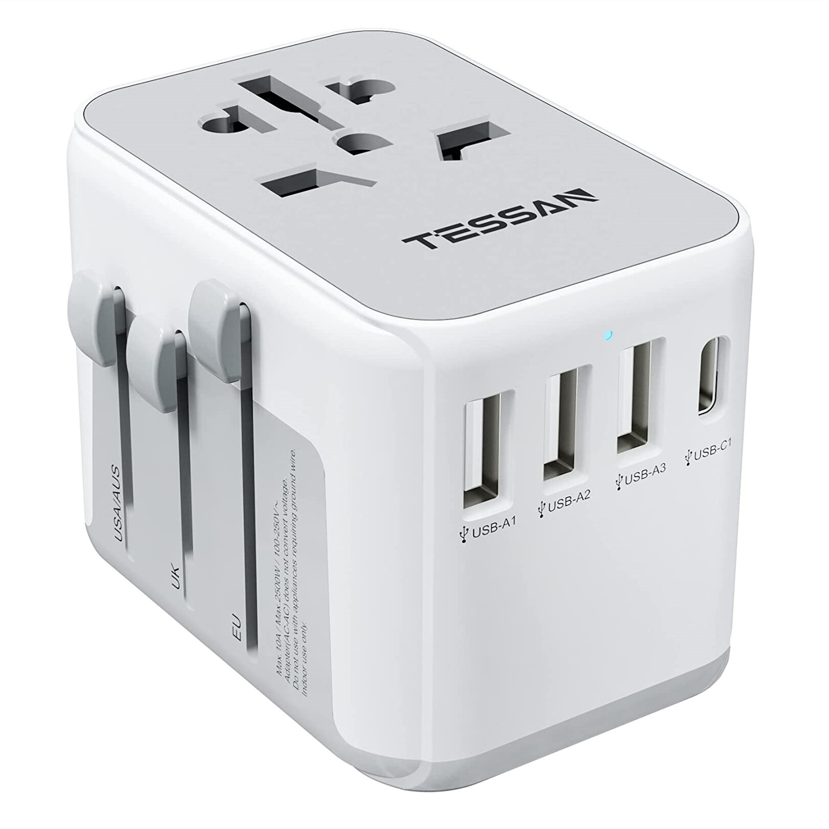 • USB C Universal Plug Adapter: The 3 USB A ports can charge up to 2.4A, and the USB C port can charge up to 3A, ideal for cell phone, tablet, power bank, laptop, camera, ect. All the USB ports output: 5V/3.4A, 17W max