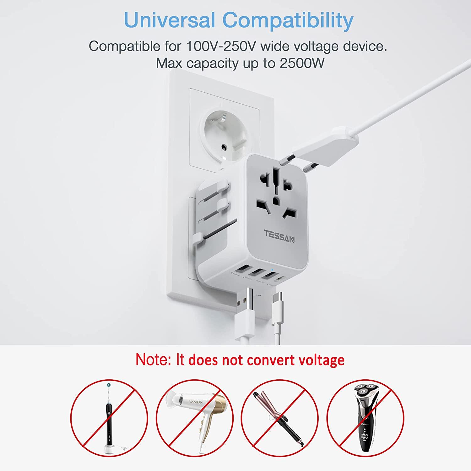 • 5 in 1 International Power Adapter: The european adapter provides a universal AC outlet and 4 USB charging ports, max capacity up to 2500 watt (max 250 Volt, 10 A), can charger up to 5 devices Simultaneously; This adapters for europe is suitable for hotel, bedroom, and college dorm room