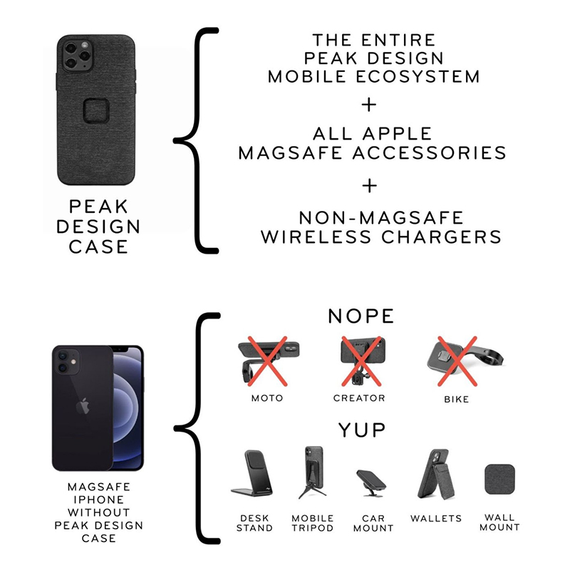 A phone case with the perfect balance of slimness, smart aesthetics, and protection, plus it brilliantly connects to the entire Peak Design Mobile Ecosystem. It's like a tuxedo for your phone—a tuxedo with a slim 2.4mm profile and protective rubberized bumper, all wrapped in beautiful nylon canvas shell. But what truly sets the Everyday Case apart is the brilliant magnetic/mechanical lock that's built right into it. We call this mounting technology SlimLink™, and it's so fast and secure that it borders on magic. With this case on your phone, you can instantly connect to all Peak Design Mobile mounts, chargers, and accessories. It even works with Apple MagSafe accessories, too.