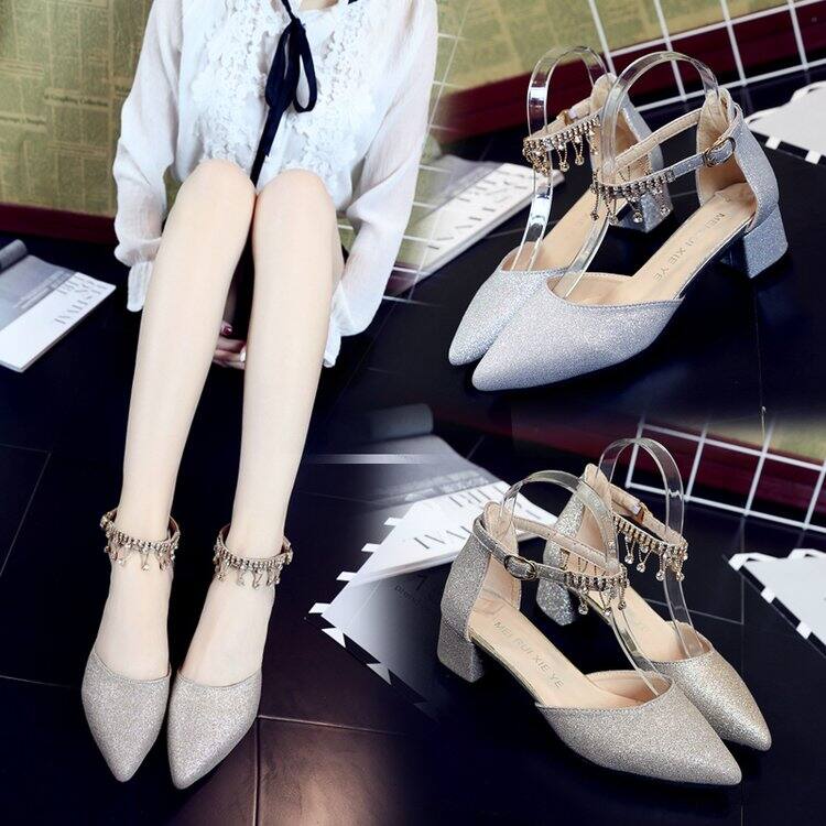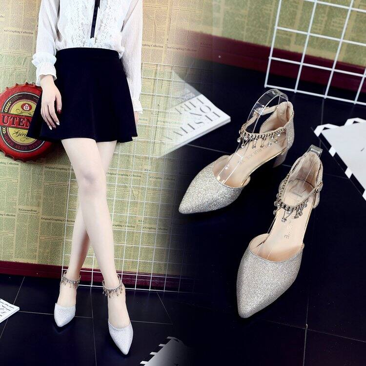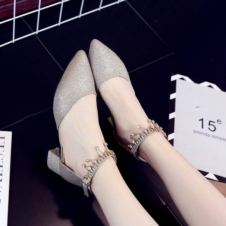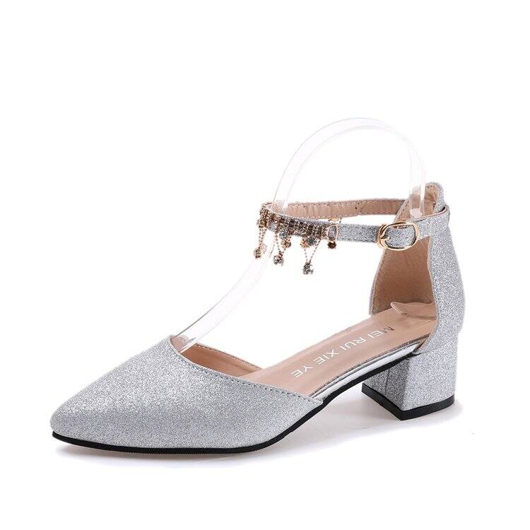 2022 Spring and Summer New Rhinestone Student Silver Low Heel 4cm Bridesmaid Shoes High Heels Single-Layer Shoes Sandals for Women