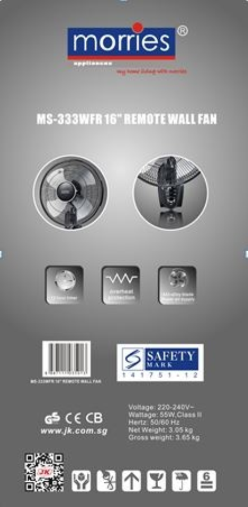 Morries 16 Inches Blade Fan Wall Fan W/Remote Control MS-333WFR