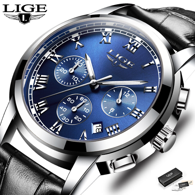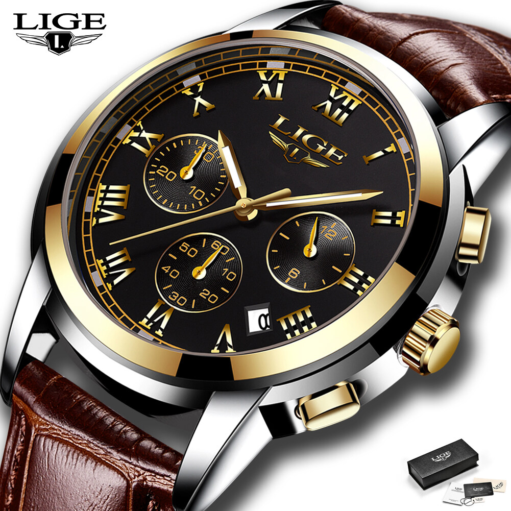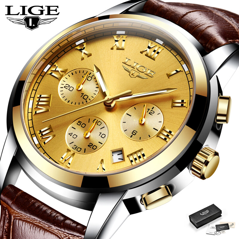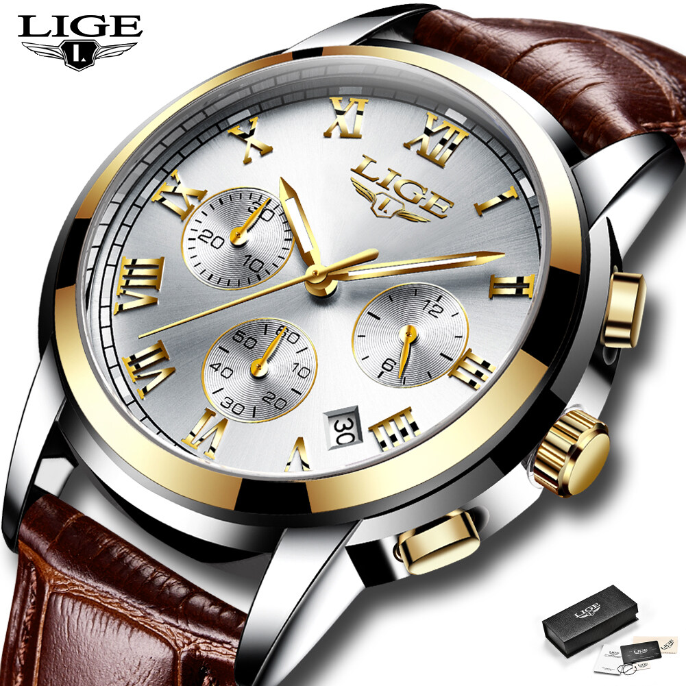 LIGE Fashion Sports Watch for Men Leather Waterproof Chronograph Luminous Pointer Wrist Watch