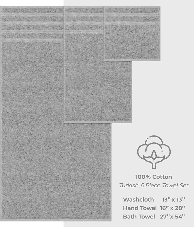 • ✅ Turkish Luxury 6 Piece Towel Set Includes 2 Bath Towels of 27 x 54 inches, 2 Hand Towels of 16 x 28 inches and 2 Washcloths of 13 x 13 inches.
