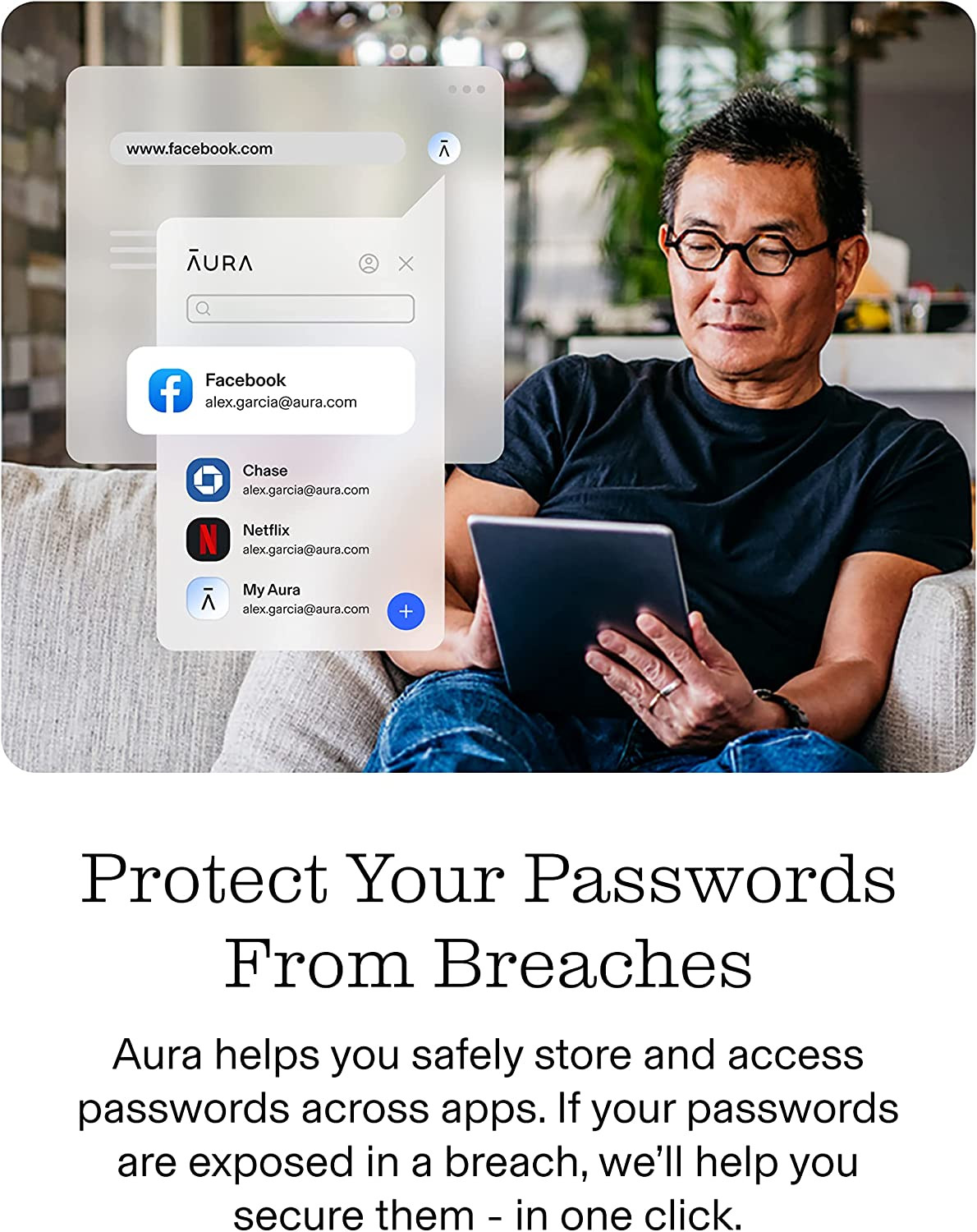 PROTECT YOUR ONLINE ACCOUNTS: Worried about data breaches? Aura lets you know if your online accounts were exposed and helps you secure them.