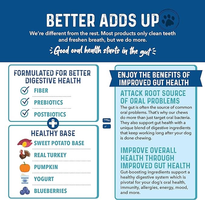 • CLEAN, TRUSTED & SAFE: All-natural, no artificial colors or flavors, grain and gluten-free, and easy to digest. Rooted in dog dental care science, GMP and SQF certified, quality tested, and made in the USA.