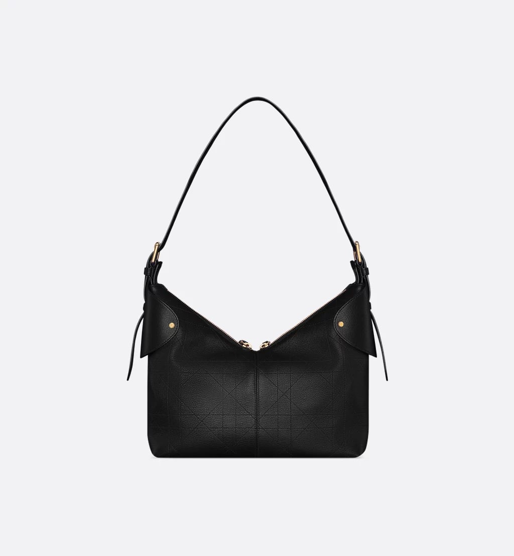 The new Dior Voyage bag from the Cruise 2026 collection features soft lines and refined details. This exquisite bag is expertly crafted from black grained calfskin and embellished with Flat Macrocannage stitching, a reinterpretation of the house's signature motif. The supple silhouette is accented with a DIOR charm in antiqued gilt metal and accented with premium leather for added structure. A two-way zipper closes the main compartment for easy access, while an adjustable top handle with a buckle allows this medium-sized bag to be carried on the shoulder as an everyday accessory.