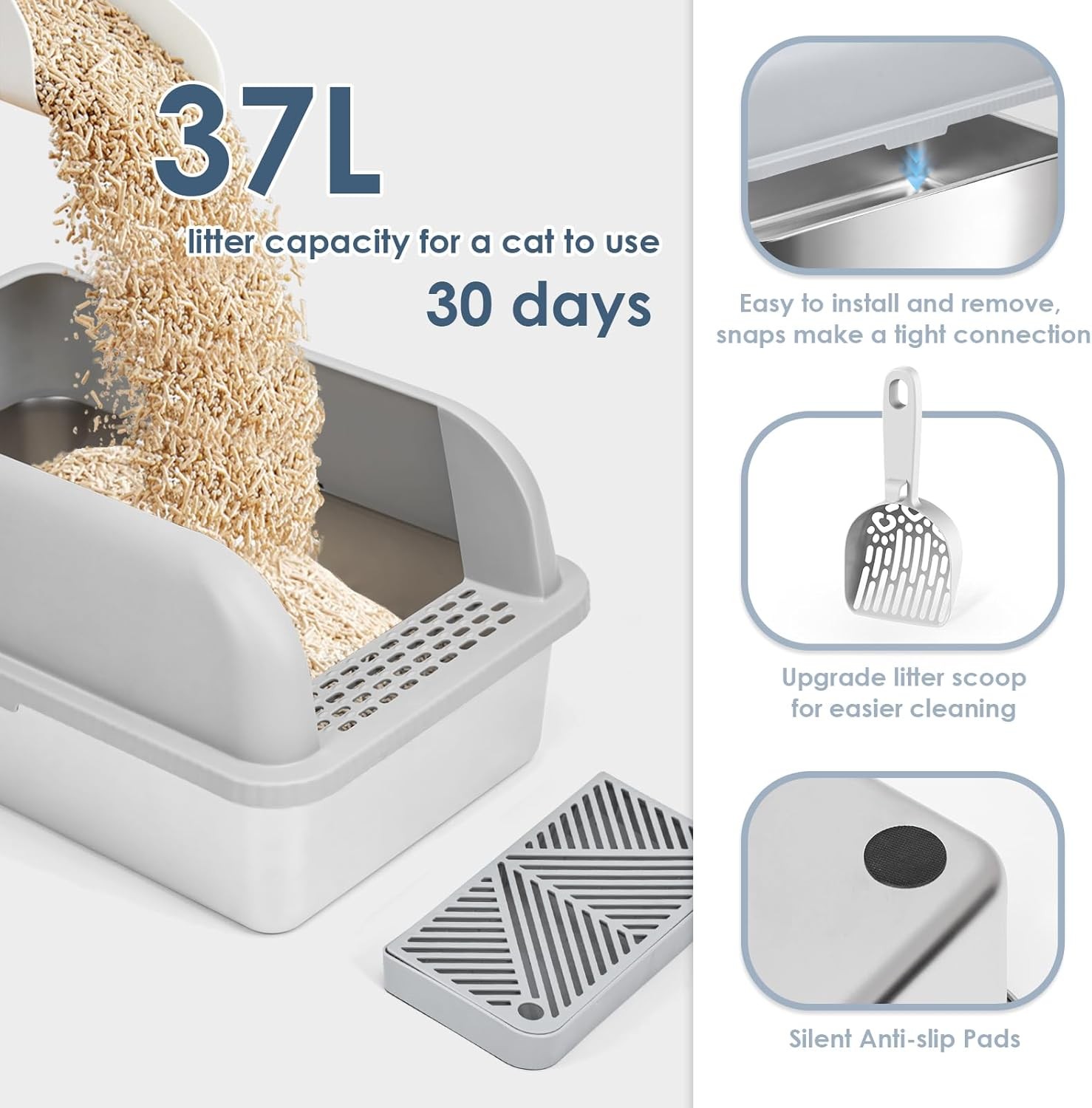 Enclosed Stainless Steel Cat Litter Box with Lid Extra Large Litter Box for Big Cats XL Metal Litter Pan Tray with High Wall Sides Enclosure, Non-Sticky, Anti-Leakage, Easy Cleaning