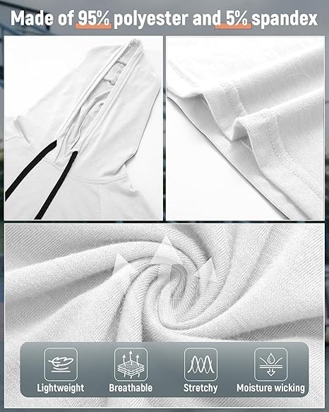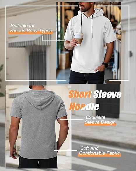 • Comfy Material: experience the texture of the men's short sleeve hoodie, composed of 95% polyester and 5% spandex; This blend results in a hoodie that is not only soft, lightweight, breathable and smooth but also features stretchy, making it an ideal gym hoodie for men