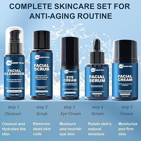 • Anti aging Skin Care Sets for Men: Our comprehensive set includes men's Facial Cleanser 60ml ,Facial Scrub 60ml,Facial Serum 30ml,Facial Cream 50ml,Eye Cream 20ml,providing a complete skin care routine for anti-aging needs.Beautiful manly packaging make it a great christmas gifts for men,stocking stuffers for husband,birthday gifts for men,valentine's day gifts for him,men's gifts.unique gifts